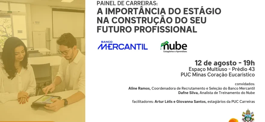 Em comemoração ao Mês do Estagiário, a PUC Carreiras te convida para um evento muito especial. O Painel de Carreiras: A importância do estágio na construção do seu futuro profissional conta com a participação do Banco Mercantil e do Nube.