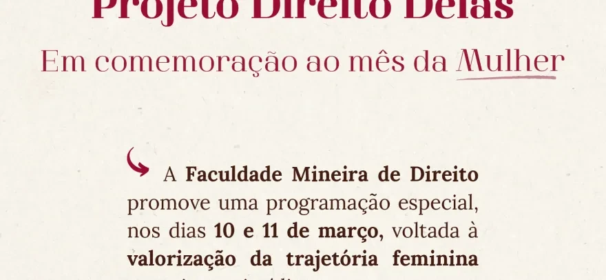 Data Inicial: Data Final:A Faculdade Mineira de Direito promove uma programação especial, nos dias 10 e 11 de março, voltada à valorização da trajetória feminina no universo jurídico. Serão momentos de escuta, troca de experiências e inspiração, reunindo grandes nomes do Direito para debater os desafios, conquistas e perspectivas das mulheres na carreira jurídica.